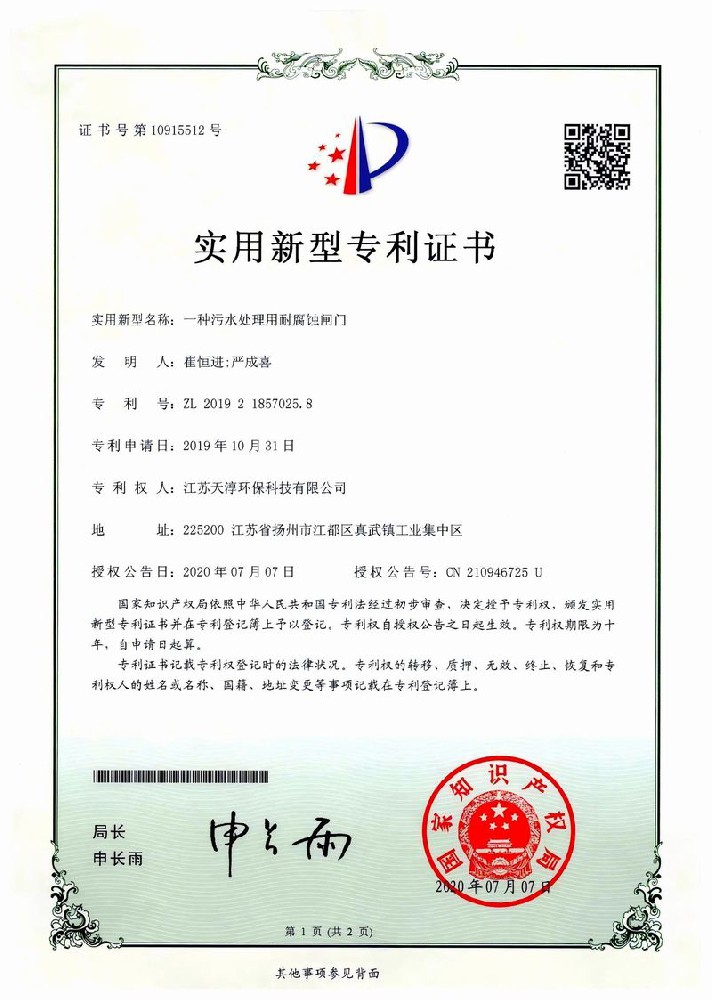 一种污水处理用耐腐蚀闸门实用新型专利证书